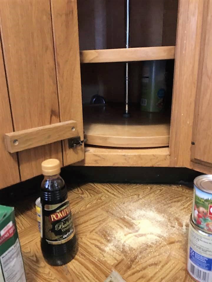 And lastly, I’ve been determined to figure out what has been blocking the lazy-susan in the kitchen from making its rounds. (And, no, my name is NOT Susan!) So I unload the entire contents except for two containers of oatmeal. Apparently, they are what is now holding up the upper level of the round-a-bout. And I have neither the tools nor that aptitude to fix this problem. Sigh. *Bangs head softly against the wall.*