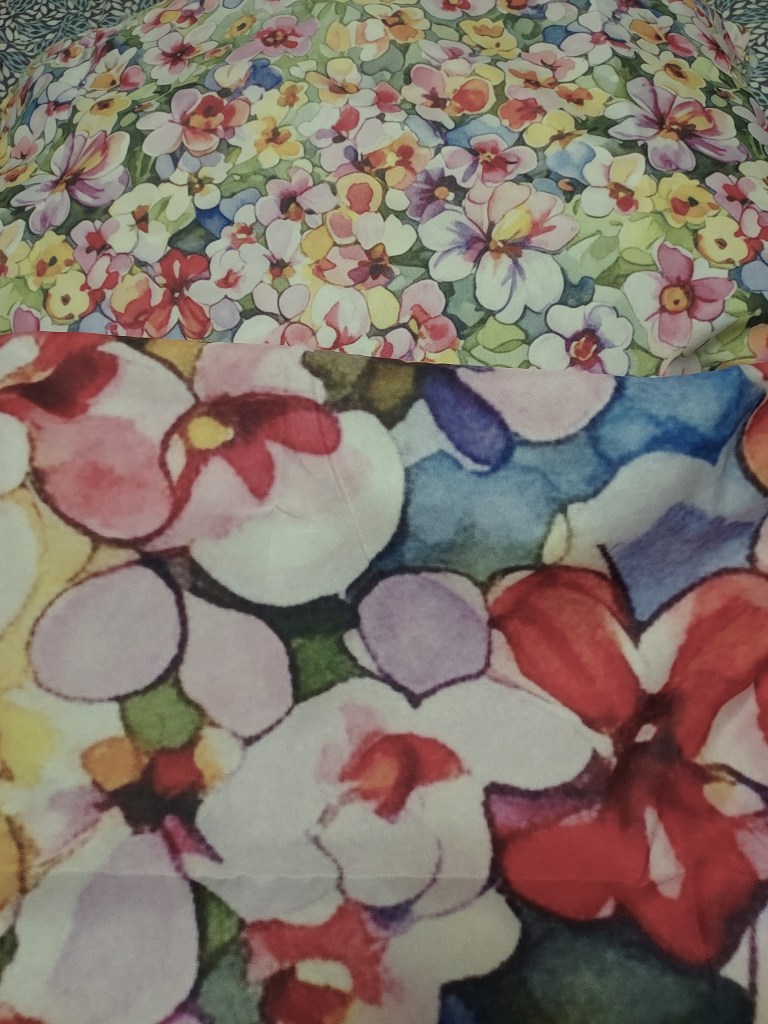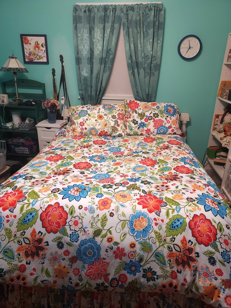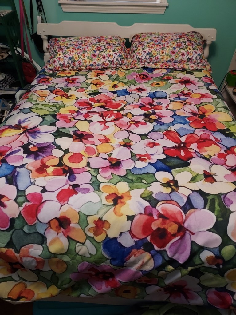I told her my sad story. Mentioned that there was a pattern of sheets I bought that I absolutely love. But, the sellers on Amazon did not have any bedspreads to match. She offered to make the duvet cover for a very reasonable price. And, I bought an extra set of sheets so she could make a matching bed skirt to replace my old one.