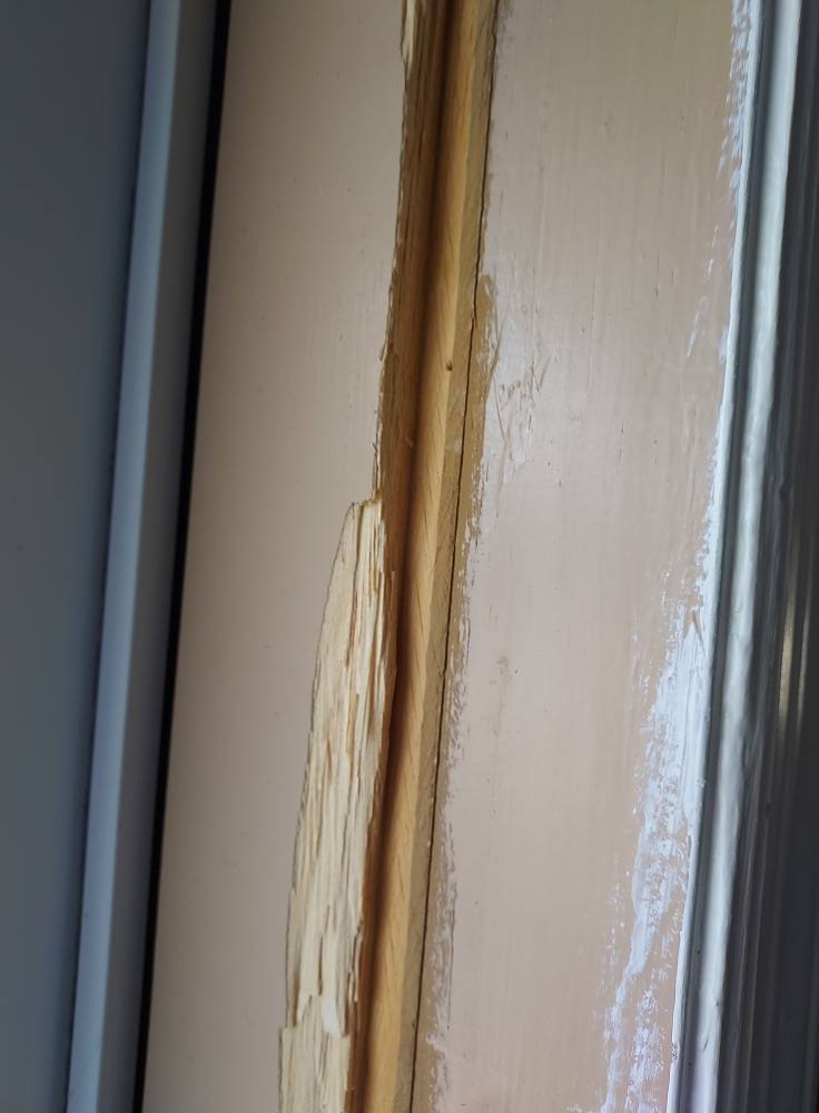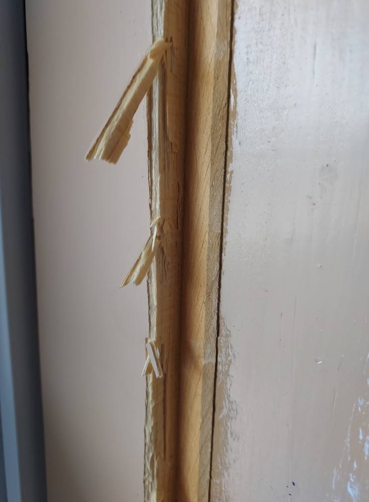 Turns out there wasn’t a strip of trim holding the decades old weather stripping in place. Nope, it was the entire door jam and very sunk-in nails doing the job.