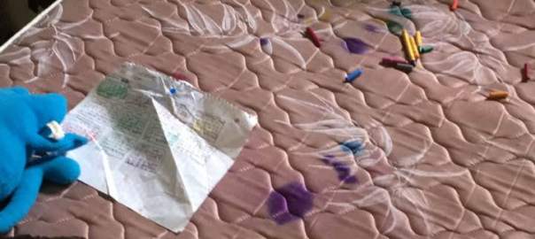 Two teardrop shaped containers of food coloring found in son’s bedroom. Two still unaccounted for. Mattress now looks like Jackson Pollock vomited there.